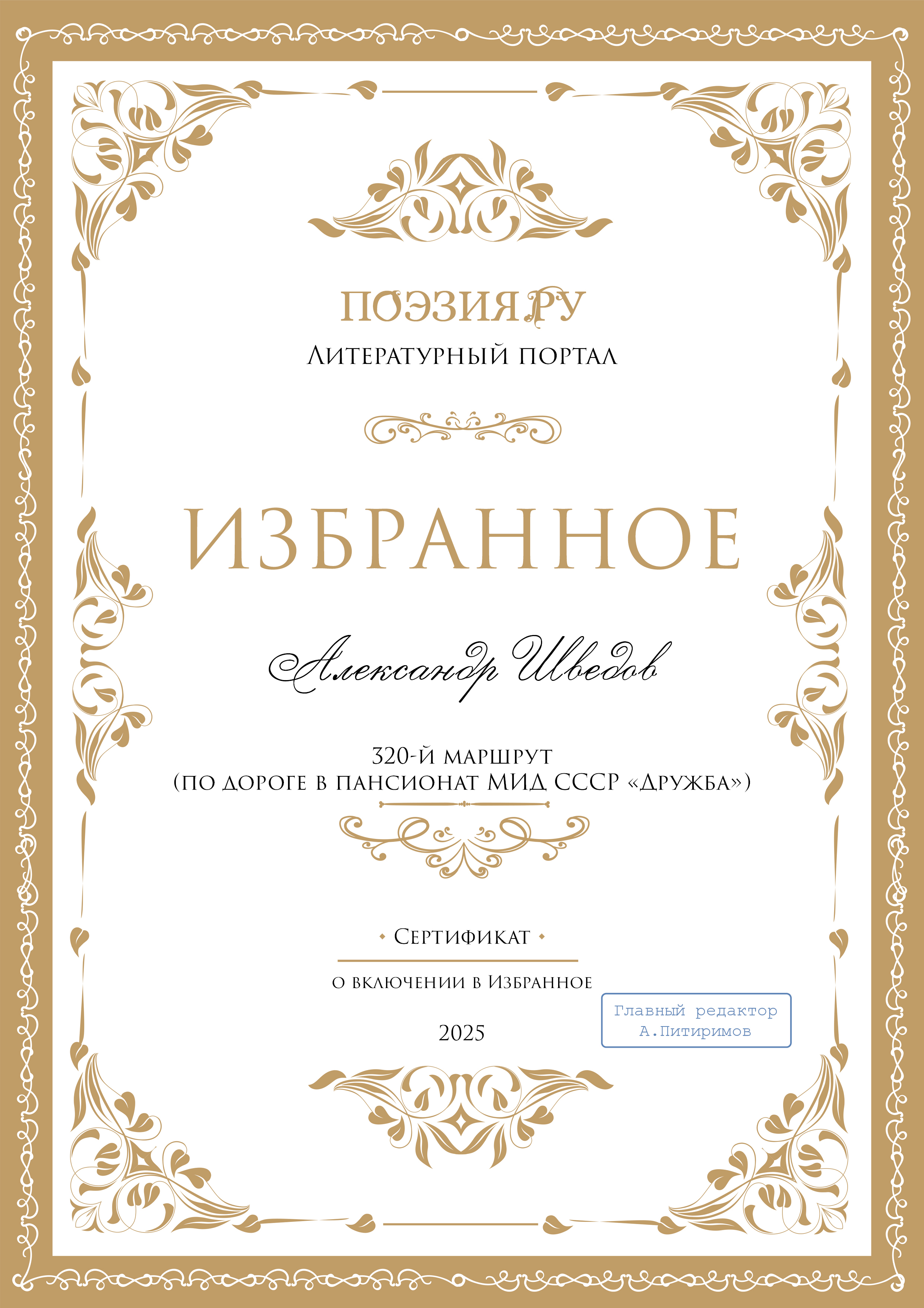 | 320-й маршрут (по дороге в пансионат МИД СССР «Дружба») | Любовная лирика | 04-06-2024 13:04:22 | 4 | 5 | 1012 | ||