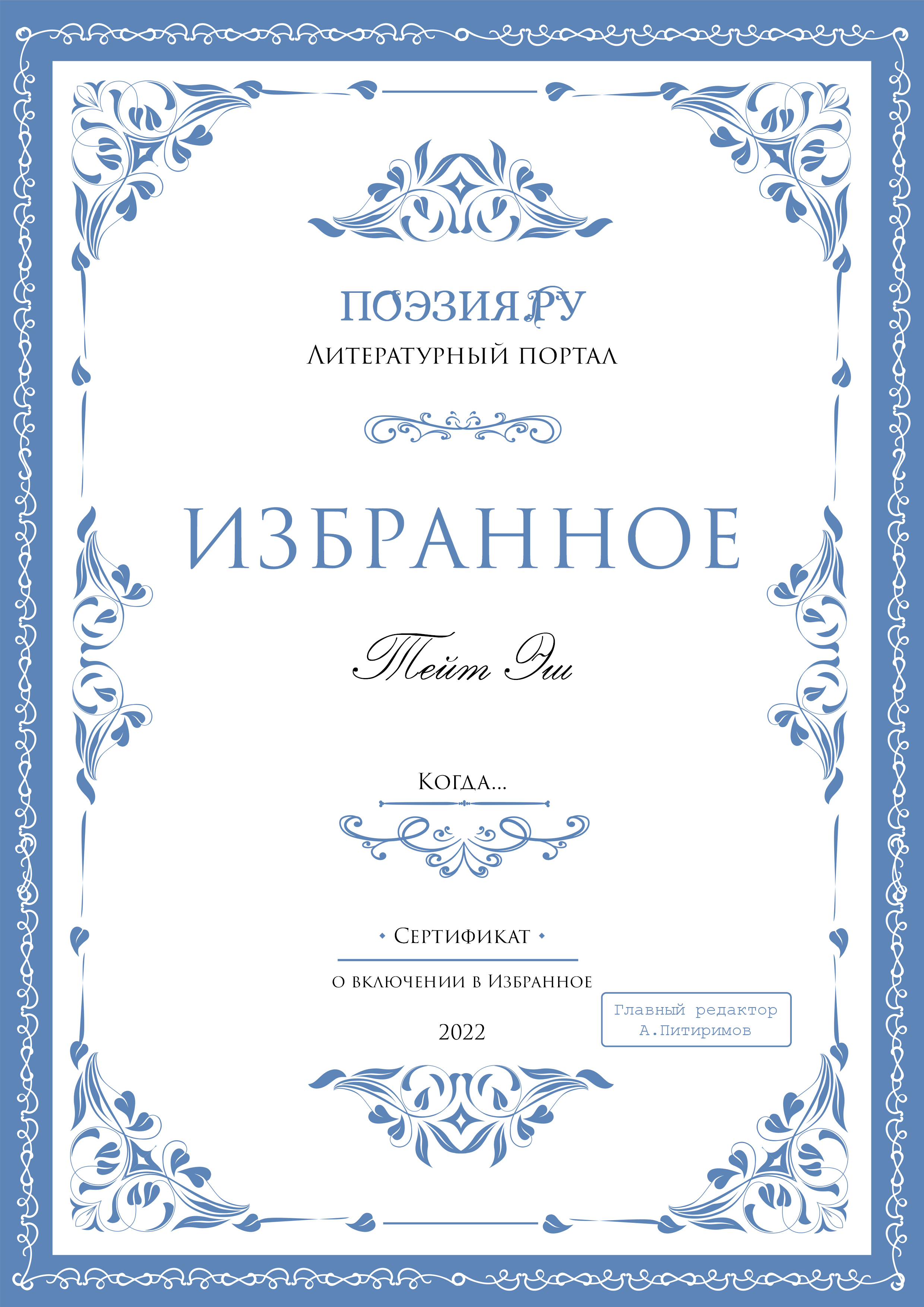 Лауреат «Кубка Мира по русской поэзии».