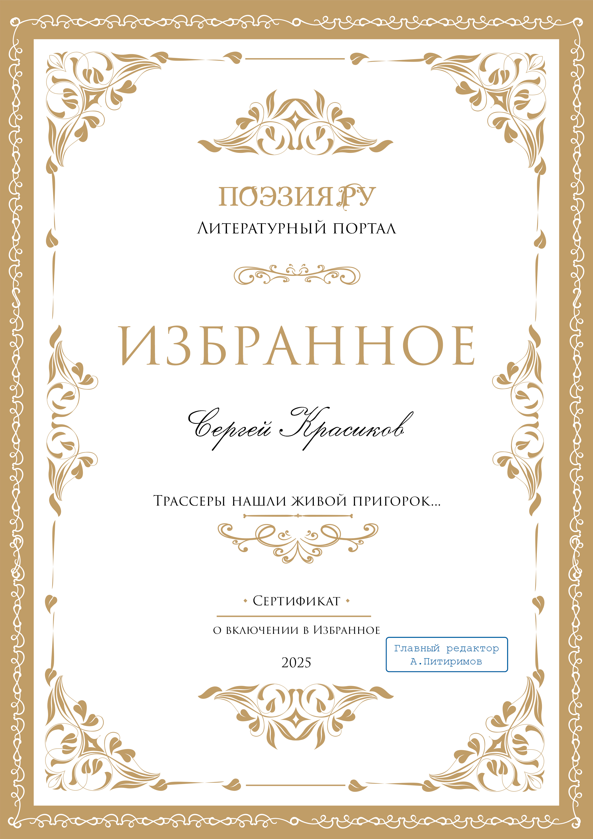 | Трассеры нашли живой пригорок... | Лирика | 09-04-2025 15:11:20 | 11 | 0 | 2524 | ||