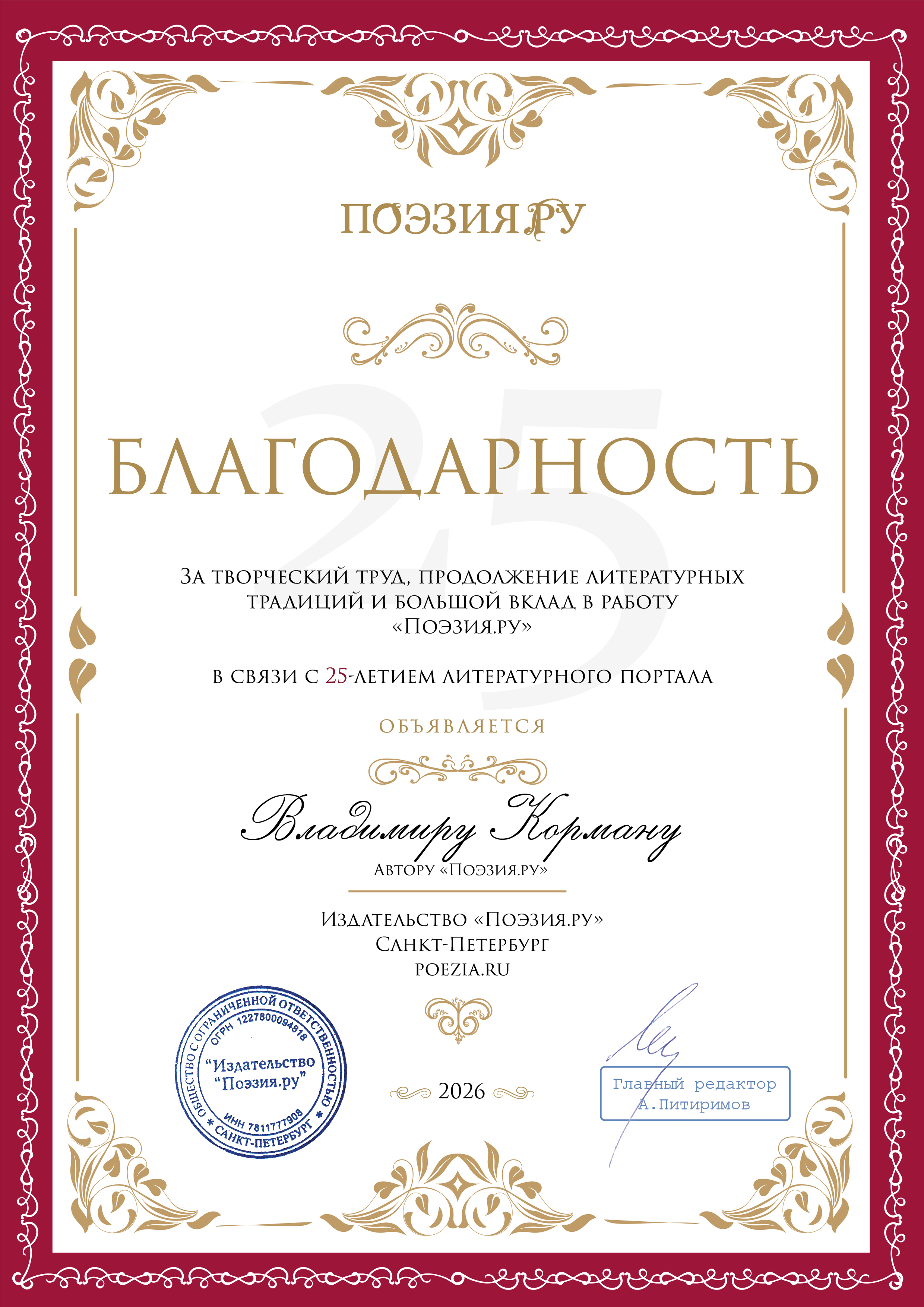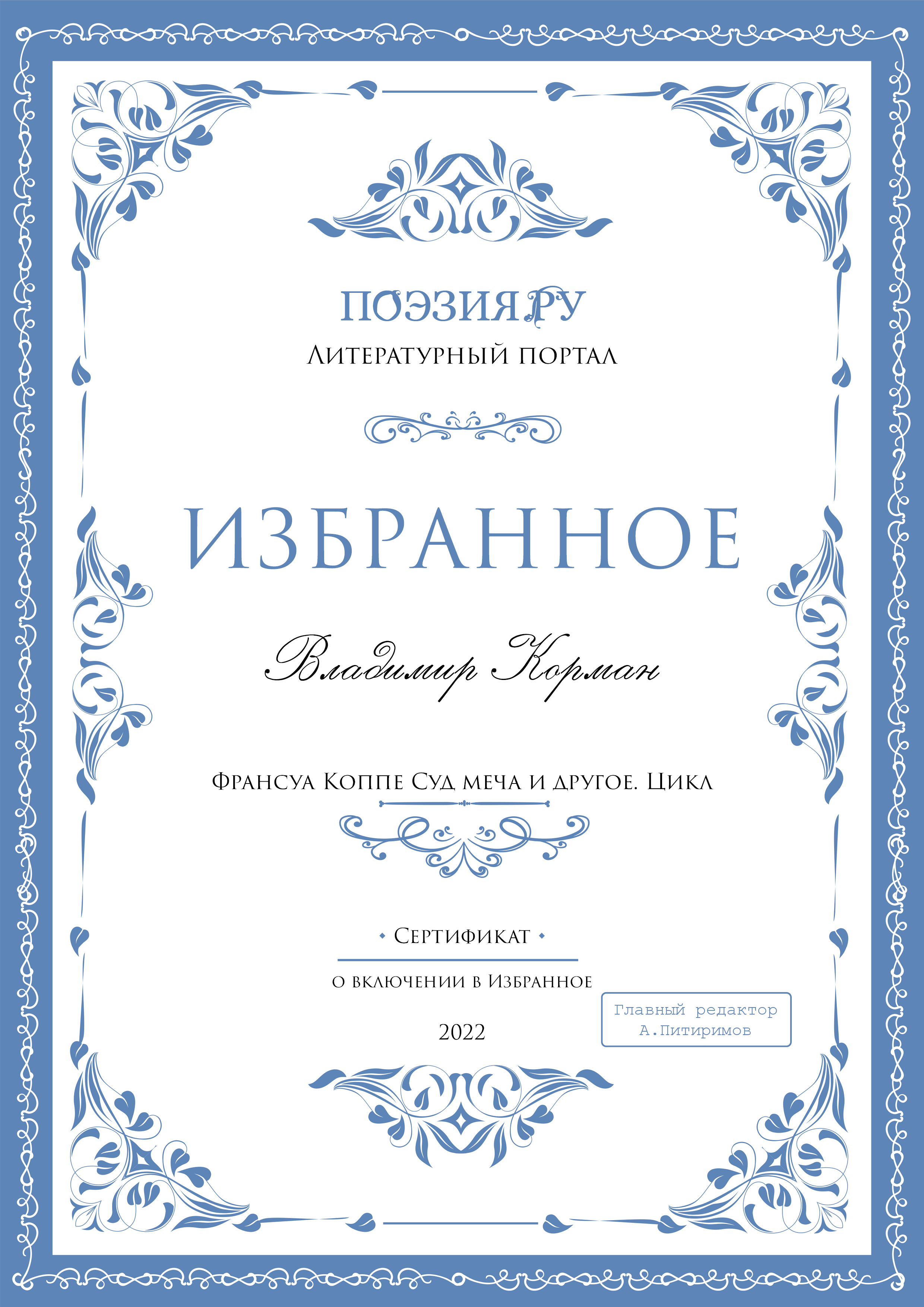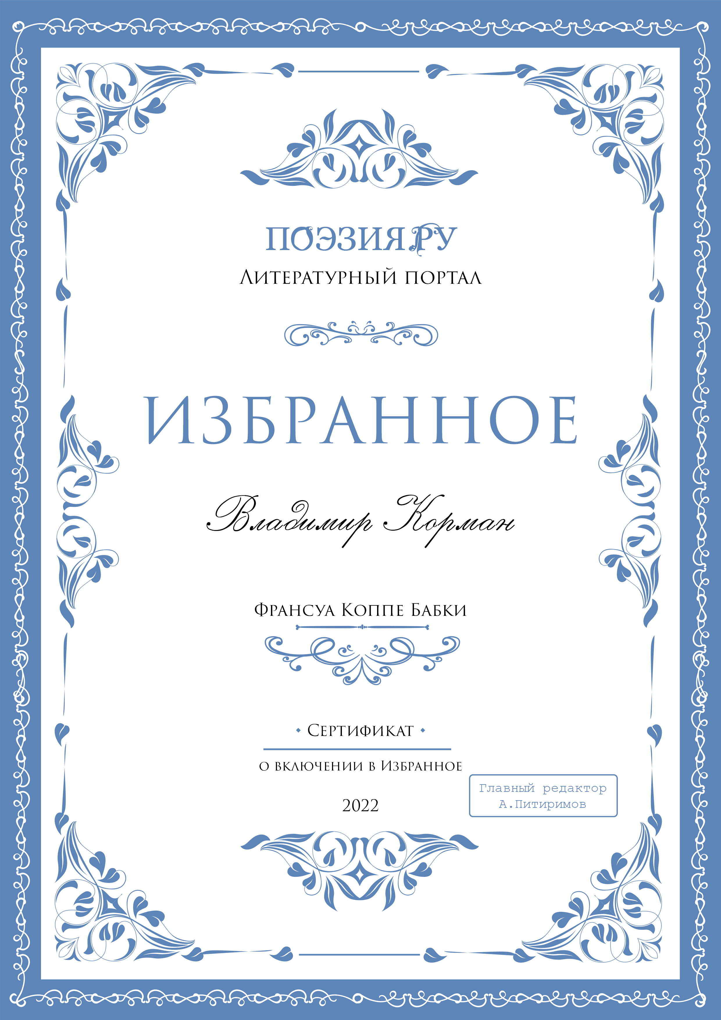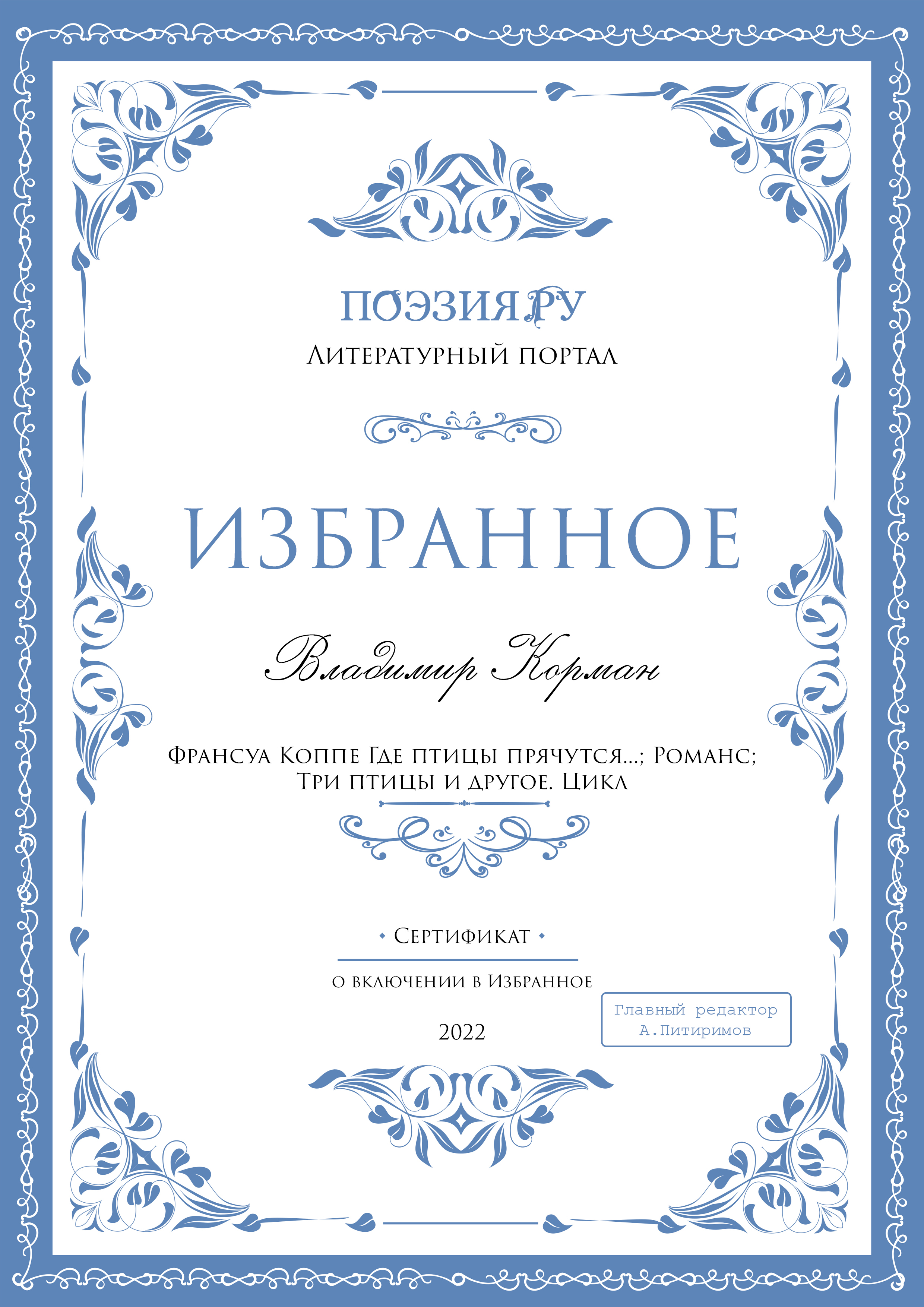 Автор-любитель родом из города Владимира. Сочинитель стихов, венков сонетов и переводов, составитель палиндромов.