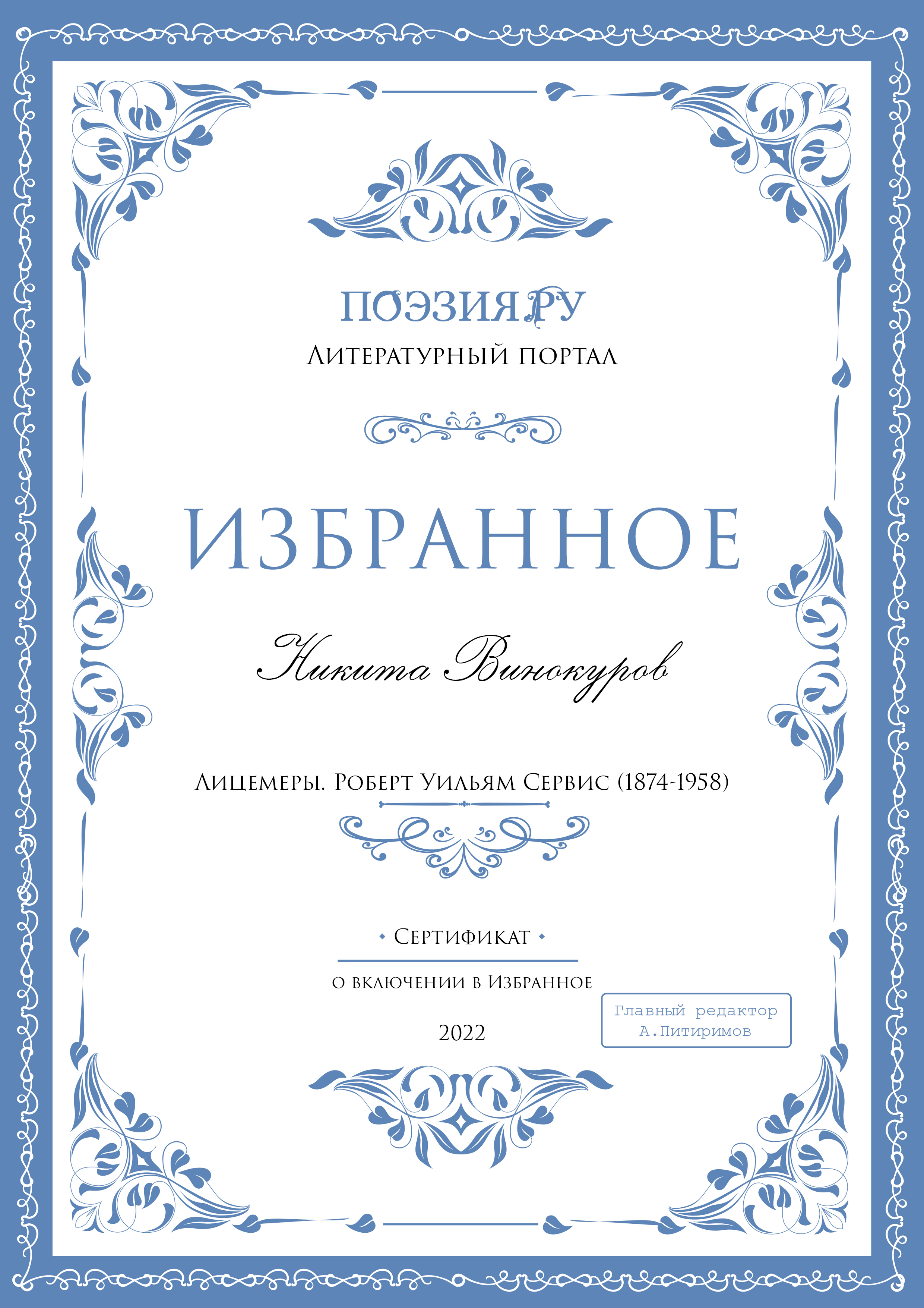 | Я и Рифма. Роберт Сервис (1874-1958) | Переводы | 11-04-2008 22:45:54 | 0 | 3 | 3106 | ||