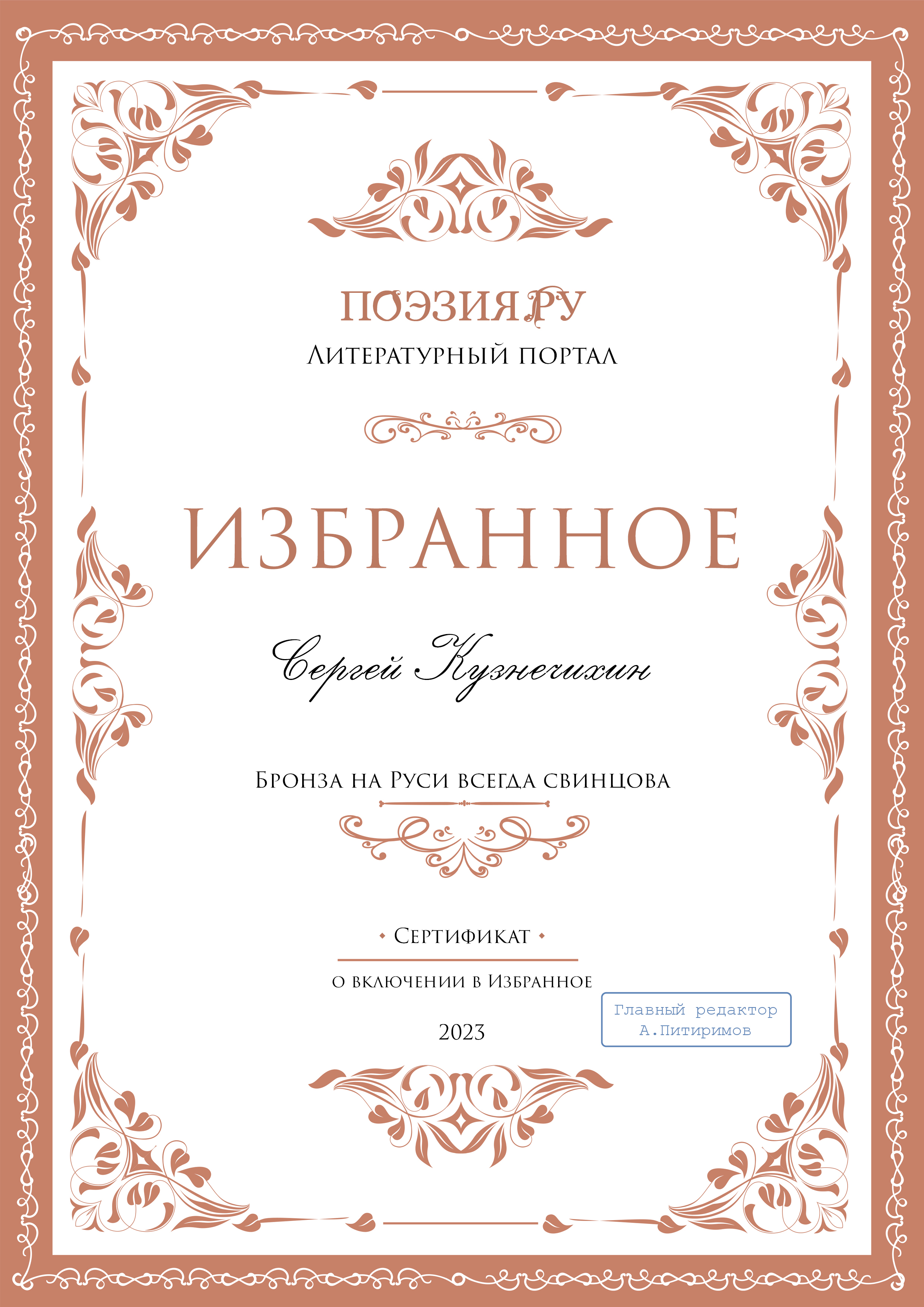 | Бронза на Руси всегда свинцова | Лирика | 02-03-2023 10:23:40 | 11 | 3 | 1344 | ||