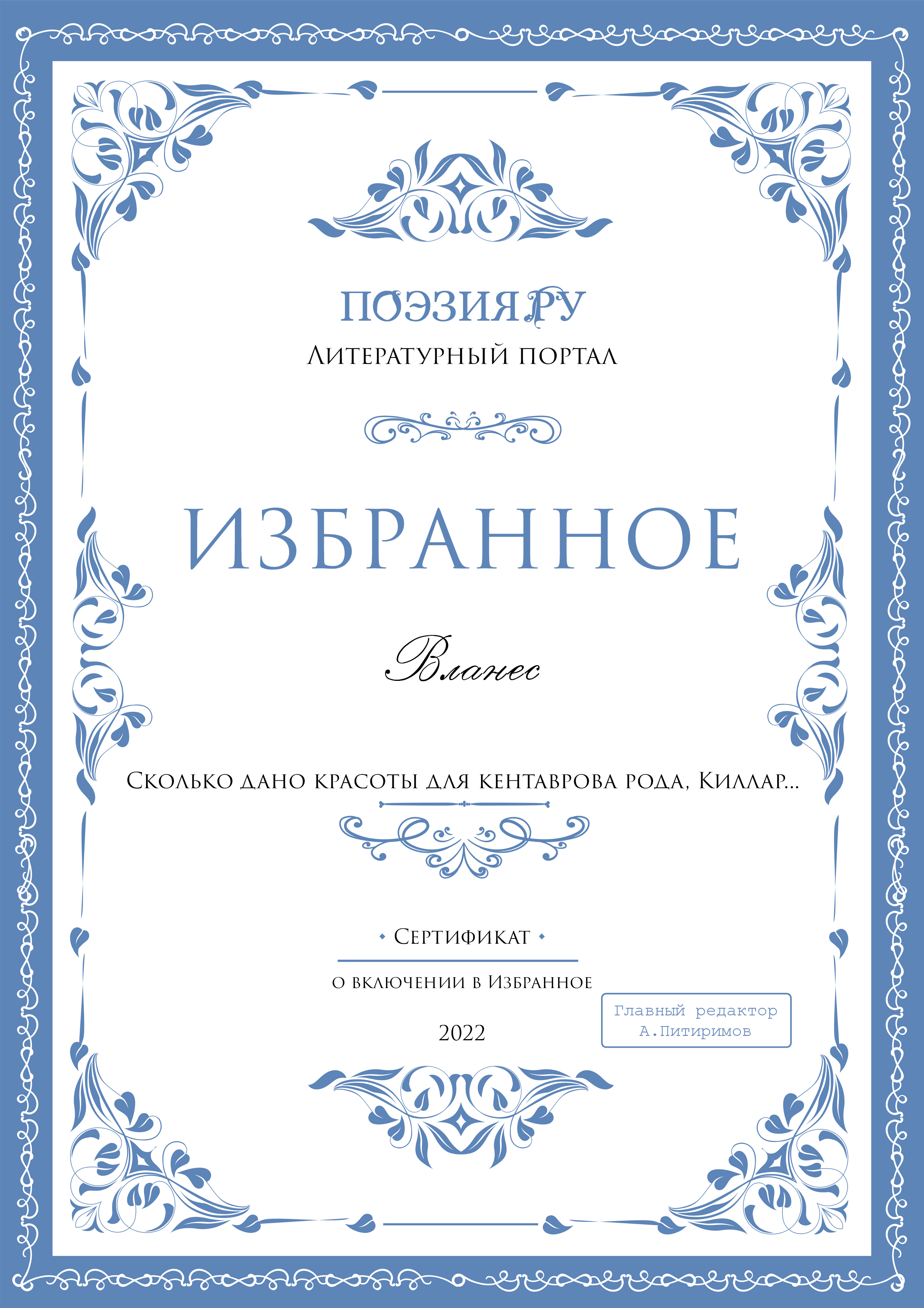 | Сколько дано красоты для кентаврова рода, Киллар... | Сонеты, канцоны, рондо, триолеты | 01-05-2022 02:03:27 | 6 | 4 | 1601 | ||
