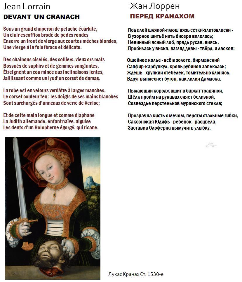 2. Есть другая "Юдифь в зелёном" Кранаха, там высокий воротник и более юная Юдифь выглядит как "лилия", некоторые детали даже более соответствуют (кроме "большой шляпы"). Возможно, стиш "совместил" две картины.
