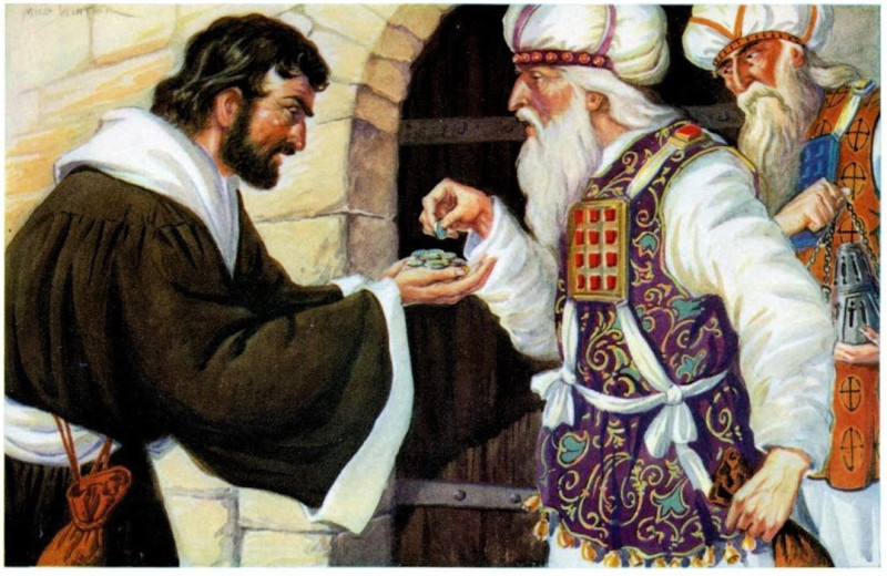 "Первосвященники, взяв сребреники, сказали: непозволительно положить их в сокровищницу церковную, потому что это цена крови. Сделав же совещание, купили на них землю горшечника, для погребения странников; посему и называется земля та «землею крови» до сего дня. Тогда сбылось реченное через пророка Иеремию, который говорит: и взяли тридцать сребреников, цену Оцененного, Которого оценили сыны Израиля, и дали их за землю горшечника, как сказал мне Господь." (Мф 27: 6-10)