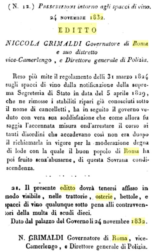 * Эдикт от 24 ноября 1832 г. об усилении контроля над остериями, подписанный Вице-Камерленго (1830 - 1833) Н.Гримальди (1768 -1845)