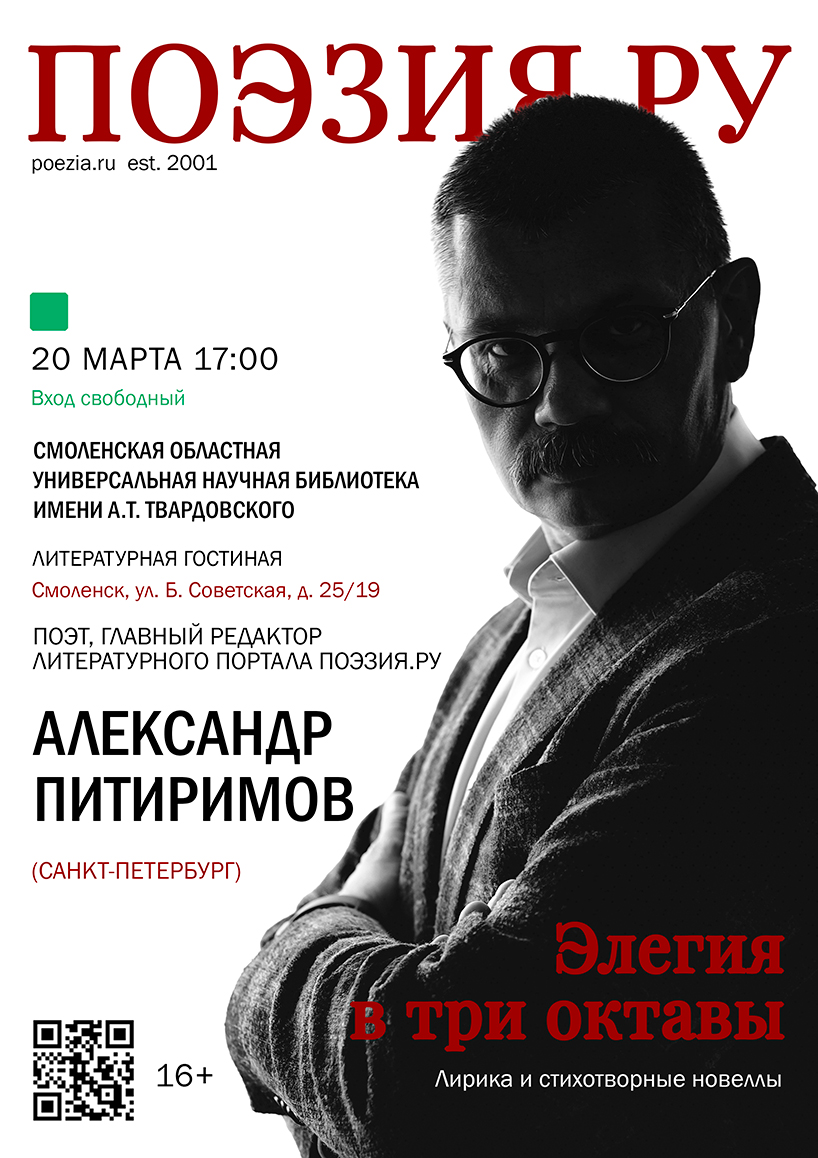 20 марта, в канун Всемирного дня поэзии в Литературной гостиной Смоленской областной универсальной научной библиотеки пройдет творческий вечер поэта, главного редактора литературного портала Поэзия.ру и одноименного издательства Александра Питиримова (Санкт-Петербург).