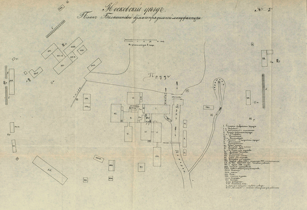 Корпус XXI. Единственная в 1880 году кирпичная казарма рабочих — трехэтажное здание, «служившее прежде для суконного производства». Это замечание Ф. Ф. Эрисмана дает нам точное представление о взаимном расположении двух Молошниковских фабрик. Бумагопрядильная находилась через плотину от пруда и стала ядром будущей Балашинской мануфактуры бумажных изделий. Молошниковская суконка была выстроена на правом берегу пруда и на некотором удалении от береговой линии. Основываясь на этой информации и уточнении Ч. М. Иоксимовича, что «на месте сгоревшей суконной фабрики <П. Т. Молошников> положил основание существующей в настоящее время бумагопрядильной фабрики, выстроив для этого каменный корпус <…> а вслед за этим выстроил каменную суконную фабрику невдалеке от сгоревшей деревянной»54, мы можем с уверенностью утверждать, что историческая фабрика Н. И. Трубецкого стояла на том же месте, где и сегодня возвышаются над плотиной производственные корпуса бывшей Балашихинской хлопкопрядильной фабрики № 1. Встречающееся в краеведческих публикациях указание на казарму как на бывший корпус «фабрики Трубецкого», не соответствует действительности. Заметим, что каменная пристройка XXI b, соединяющая казарму с каменным складом для хранения хлопка (XVI) и делающие дошедшее до наших дней здание Молошниковской суконки П-образным, согласно описанию Ф. Ф. Эрисмана, — «новая», т.е. построена в процессе реновации Балашинской мануфактуры во второй половине 1870-х годов.