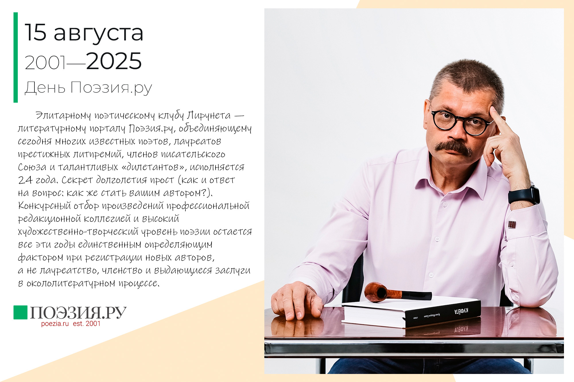 Элитарному поэтическому клубу Лирунета — литературному порталу Поэзия.ру, объединяющему сегодня многих известных поэтов, лауреатов престижных литпремий, членов писательского Союза, признанных мастеров и талантливых «дилетантов», исполняется 24 года. Секрет долголетия прост (как и ответ на вопрос: «как же стать вашим автором?»). Конкурсный отбор произведений профессиональной редакционной коллегией и высокий художественно-творческий уровень поэзии остается все эти годы единственным определяющим фактором при регистрации новых авторов, а не лауреатство, членство или выдающиеся заслуги в окололитературном процессе.