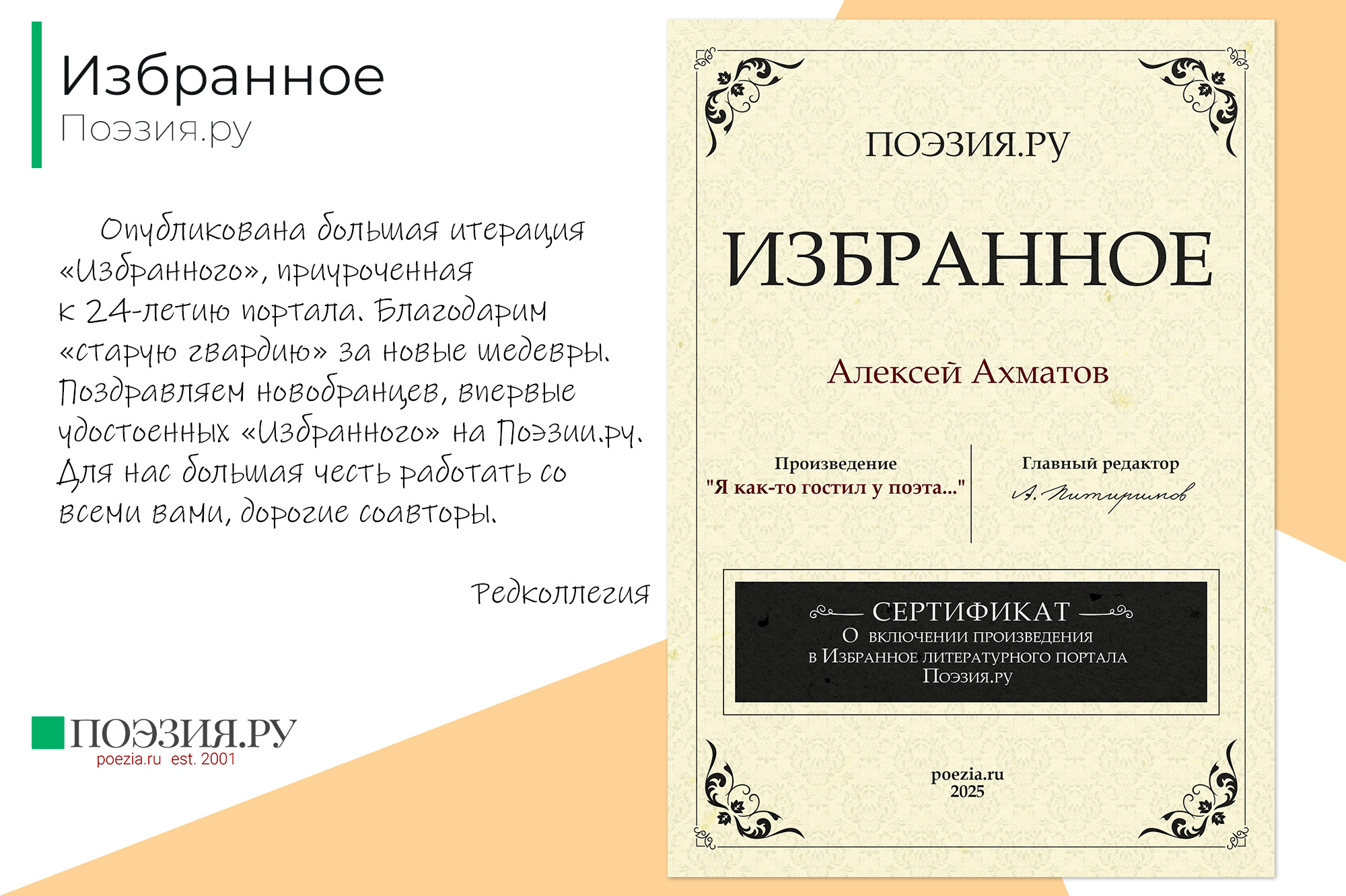Опубликована большая итерация «Избранного», приуроченная к 24-летию портала. Благодарим «старую гвардию» за новые шедевры. Поздравляем новобранцев, впервые удостоенных «Избранного» на Поэзии.ру.