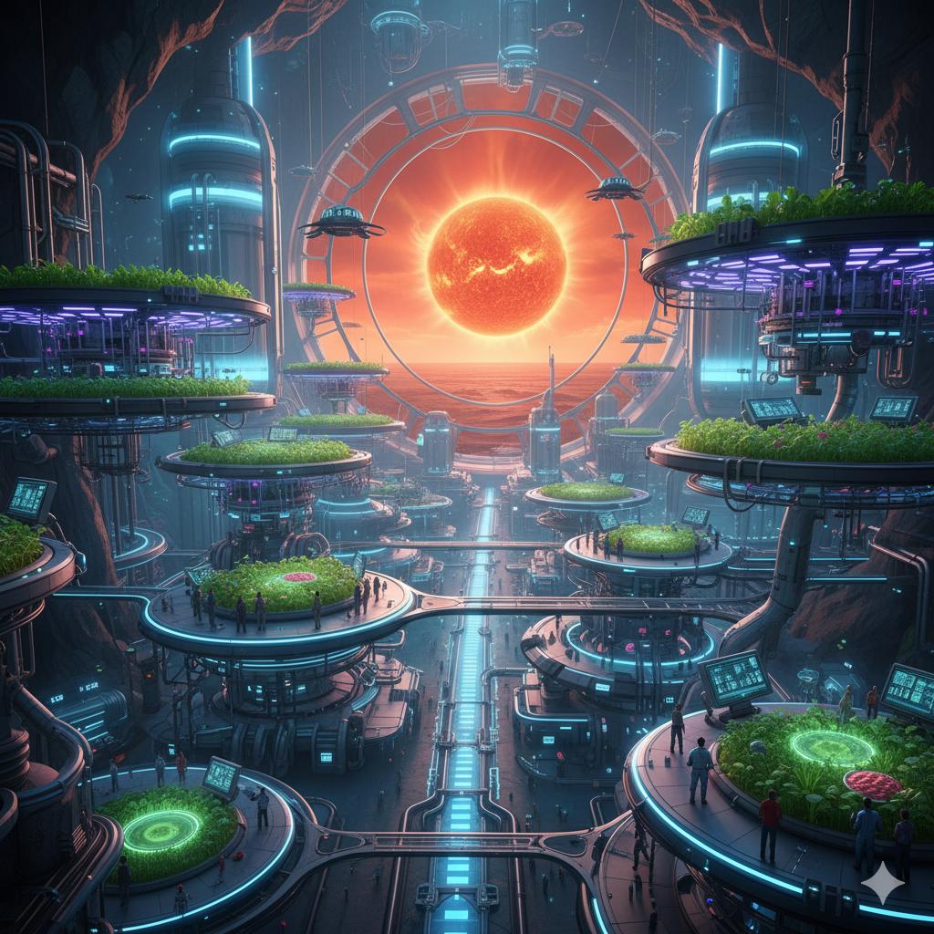 Именно такие системы будут абсолютно необходимы в условиях "безумного Солнца", где поверхность планеты станет непригодной для традиционного земледелия из-за жары, засухи, пыли и радиации. Выращивание под землей или в защищенных сооружениях становится единственным вариантом.