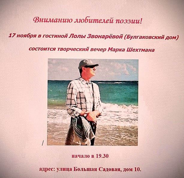 Марк Шехтман выступит с авторскими вечерами в Москве.Гостиная Лолы Звонарёвой (Булгаковский дом) (Б. Садовая, 10).17 ноября в 19:30