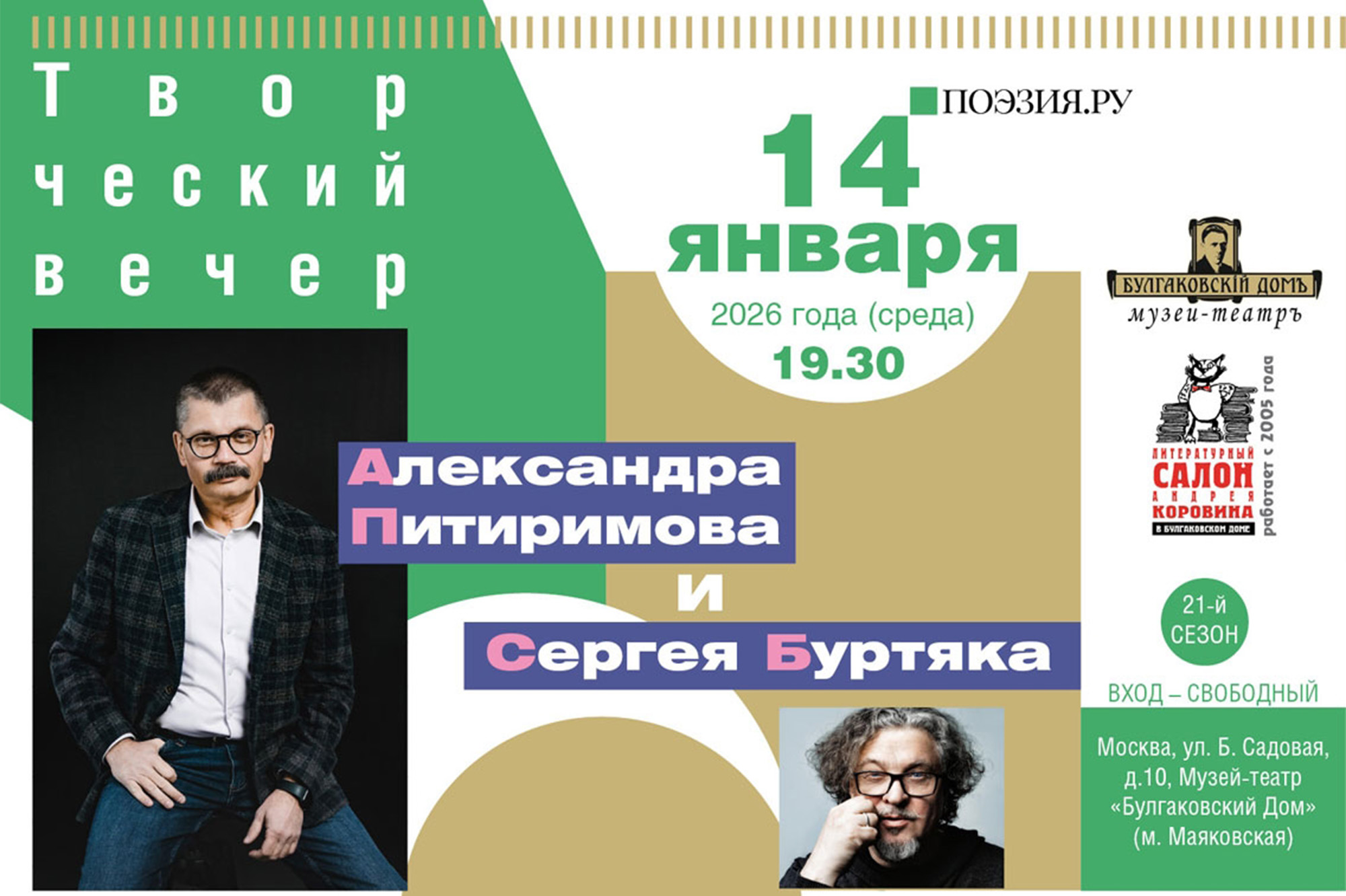 Музей-театр «Булгаковский Дом». Литературный салон Андрея Коровина в «Булгаковском Доме». 21-й СЕЗОН. 14 января 2026 года (среда) 19.30