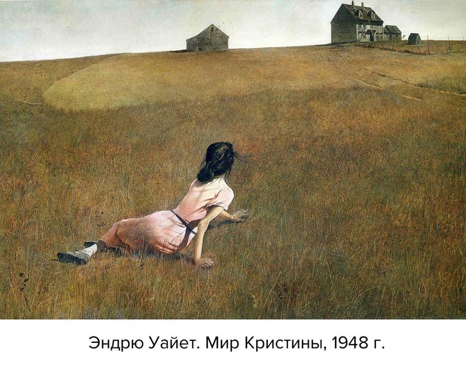 * Соседка художника, Кристина Ольсон, наполовину парализованная, отказывалась от инвалидного кресла, не желая признавать себя побеждённой болезнью. По своему ранчо Кристина передвигалась ползком. В американской культуре она стала символом стойкости и мужества. Кристина Ольсон прожила более 70 лет.