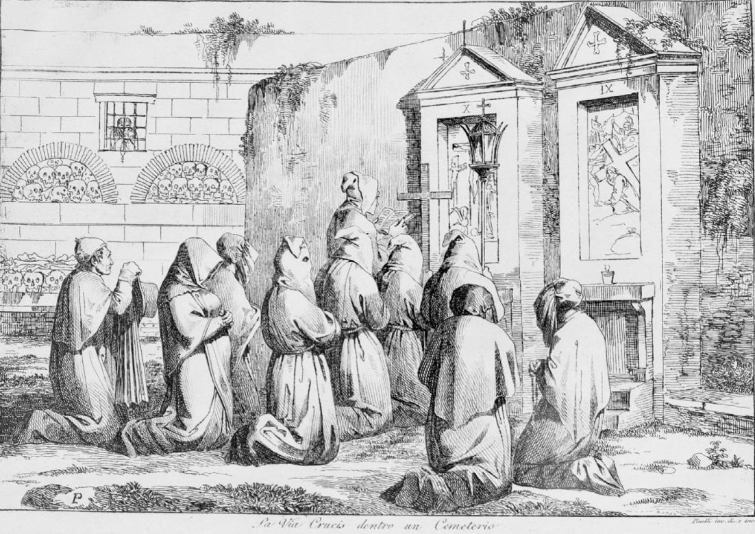 * До эпидемии холеры захоронение на кладбищах рассматривалось как “нечестивое осквернение” (3 сентября 1835 г. Кардинал-Викарием К. Одескальки было торжественно освящено кладбище Сан Лоренцо, строительство которого началось при французском правительстве и было прервано после реставрации Папы)