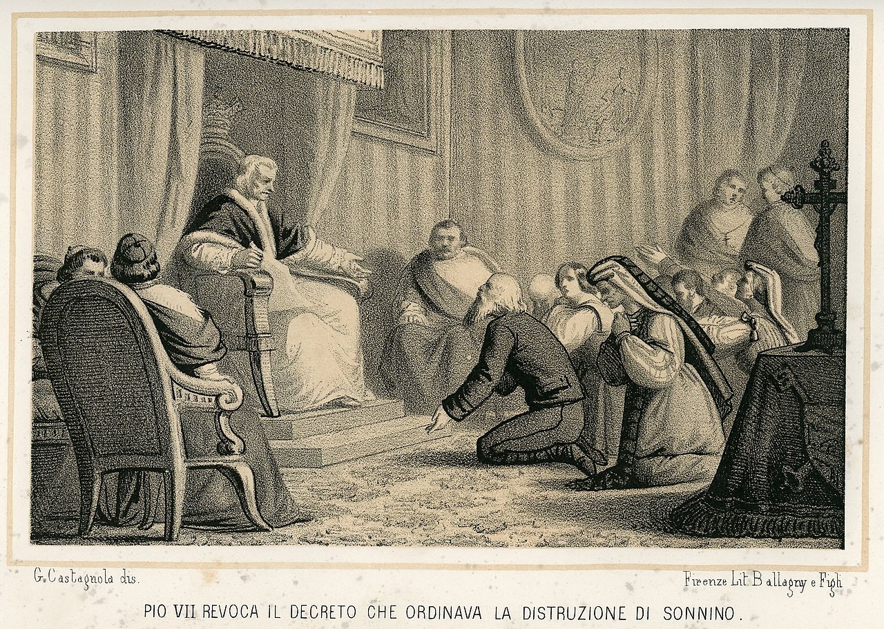 Соннино - коммуна в Лацио в составе Папской области на границе с Королевством обеих Сицилий; в 1819 г. при Пие VII кардиналом А. Паллотта (1770 - 1834) был инициирован указ о разрушении города и о принудительном переселении населения Соннино, чтобы решить проблему банд бригантов Кампаньи (указ успели отменить)